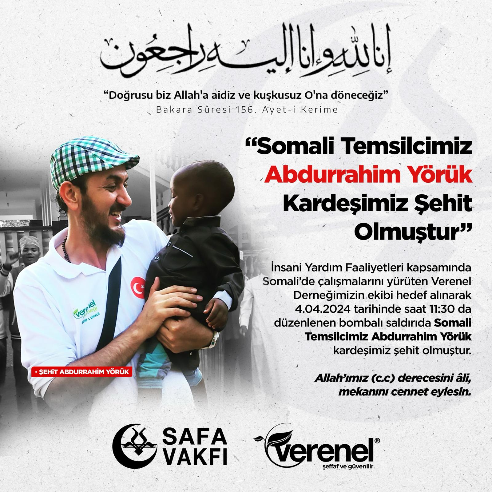Paylaşımda, “İnsani Yardım Faaliyetleri kapsamında Somali’de çalışmalarını yürüten Verenel Derneğimizin ekibi hedef alınarak 4.04.2024 tarihinde saat 11:30 da düzenlenen bombalı saldırıda Somali Temsilcimiz Abdurrahim Yörük kardeşimiz şehit olmuştur. Allah’ımız (c.c) derecesini âli, mekanını cennet eylesin.” notu düşüldü.