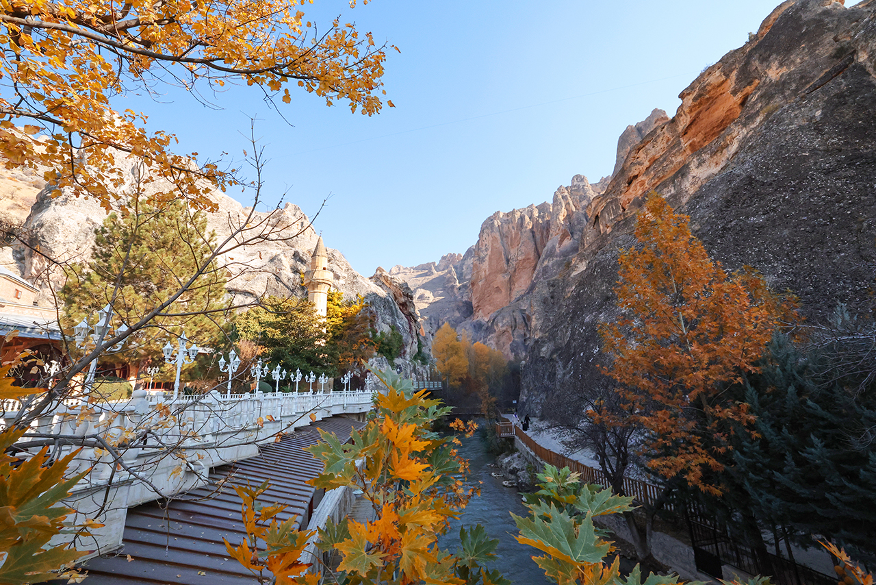 Külliye alanındaki yüksek kayalıklara tırmanan sarmaşıklar ve etrafındaki ağaçlar, renk cümbüşüyle ziyaretçilerine doyumsuz bir manzara sunuyor.