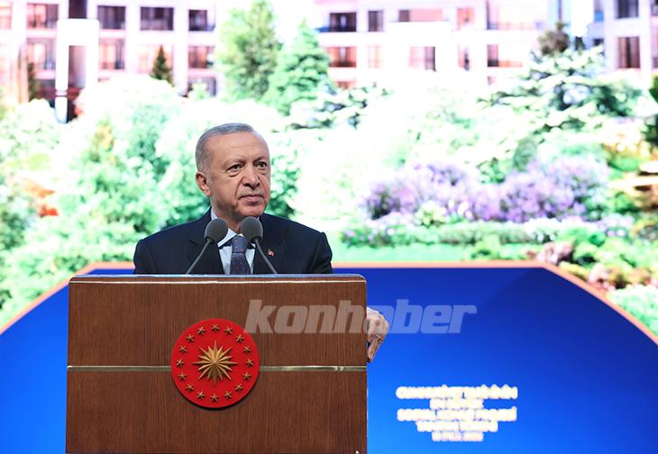 Erdoğan, "Ülkemizin her yerinde, yüz binlerce yeni sosyal konutun, konut arsasının ve iş yerinin inşa sürecini başlatıyoruz." diye konuştu.