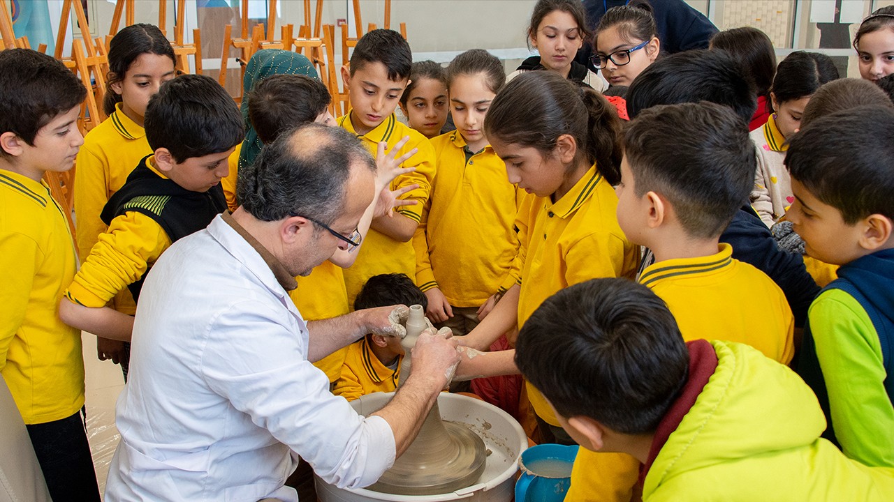 Selçuk Üniversitesi Güzel Sanatlar Fakültesi ile Dilek Sabancı Devlet Konservatuvarının KYK öğrenci yurtlarında yürüttüğü atölye çalışmaları kapsamında afetzede çocuklar, toprak kaplar üretip drama ve Türk halk oyunları etkinliklerine katıldı.