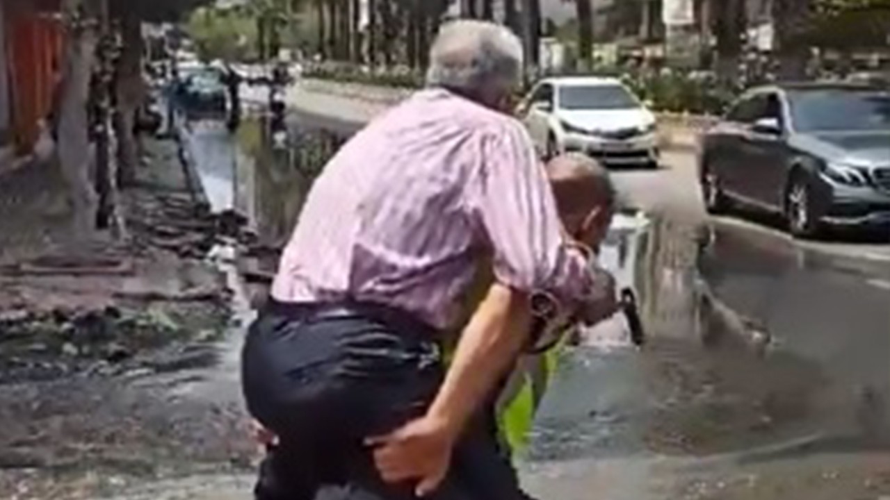 Kahramanmaraş merkezli depremlerden etkilenen İskenderun'un sahil kesiminde zaman zaman su baskınları meydana geldi. Suların tamamen çekilmediği sahil şeridindeki Çay Mahallesi Atatürk Caddesi'nde, kimliği bilinmeyen bastonlu depremzede, yolun karşısına geçmek istedi ancak yapamadı. İlçe Emniyet Müdürlüğü'ne bağlı trafik polisi Hasan Aba, durumu fark edip depremzedenin önce elinden tuttu, zorlandığını fark edince de sırtına alıp yolun karşısına geçirdi. O anlar, çevredeki kişinin cep telefonuyla görüntülenip, sosyal medyada da paylaşıldı. Takipçiler, bu örnek davranışından dolayı polisi kutladı.