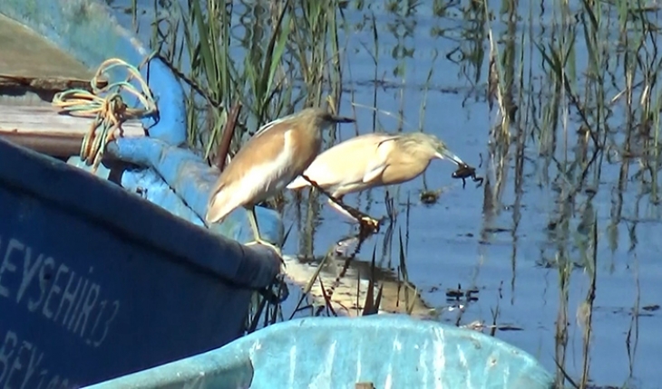 İçerişehir Mahallesi kıyısında, tekne üzerinde avı için suları gözleyen bir balıkçıl kuşunun aniden kalkış yaparak sazlar arasında suya dalış yapıp yakaladığı kurbağayı tekrar beklediği teknenin yanına getirip konduğu halat üzerinde yediği anlar da kameralara yansıdı. Göl kıyılarındaki teknelerin üzerinde ve otlarla kaplı su yüzeyinde bekleyerek sığ sularda av için dakikalarca bekleyen balıkçıl kuşları, gün boyu küçük balıklarla besleniyor.