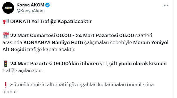 Konya AKOM, KONYARAY Banliyö Hattı çalışmaları kapsamında Meram Yeniyol Alt Geçidi'nin belirli bir süre trafiğe kapatılacağını duyurdu.
