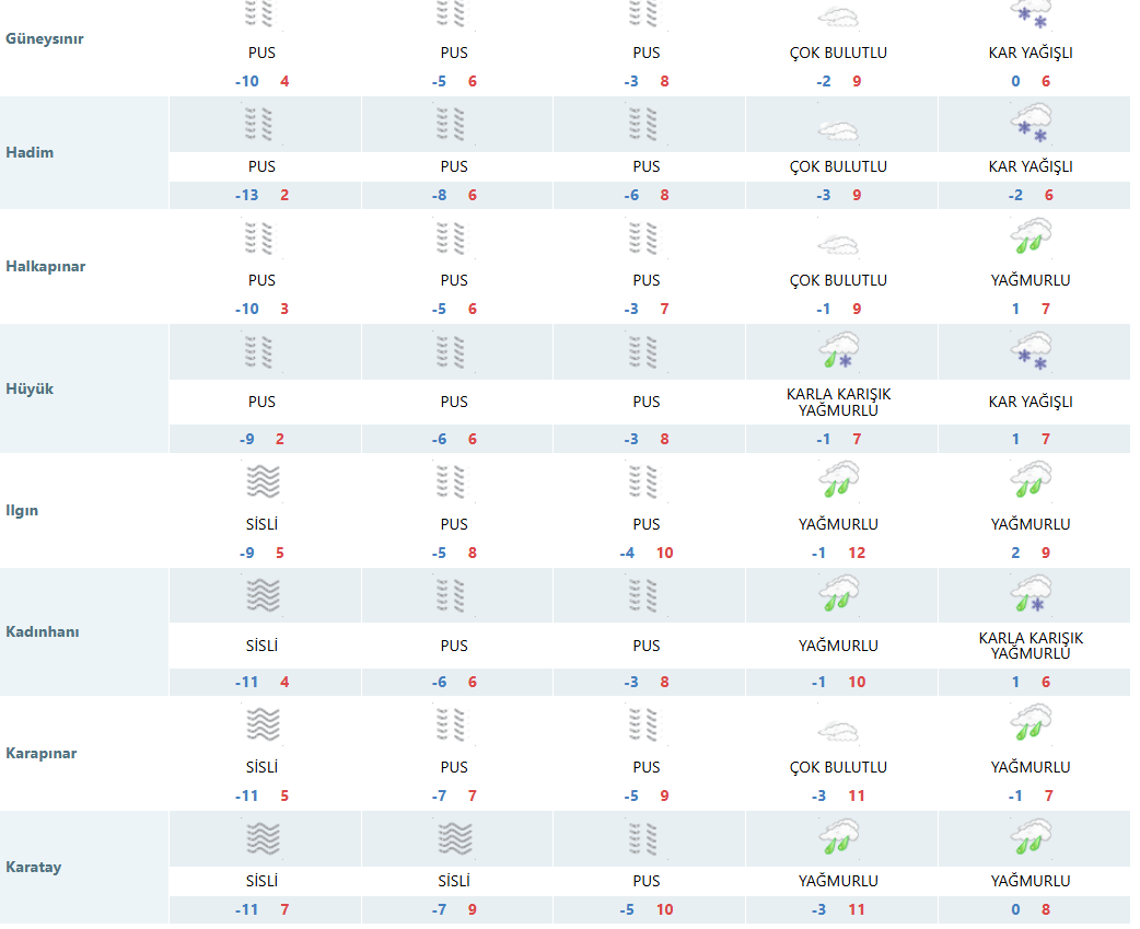 Cumartesi günü Konya'nın özellikle iç kesimlerinde ve yüksek bölgelerinde kar yağışı görülebilir. Karla karışık yağmur beklenen ilçeler arasında Seydişehir, Beyşehir, Derbent ve Hadim gibi yüksek rakımlı bölgeler yer alıyor. Düz kesimlerde ise genellikle yağmur şeklinde düşmesi öngörülüyor.