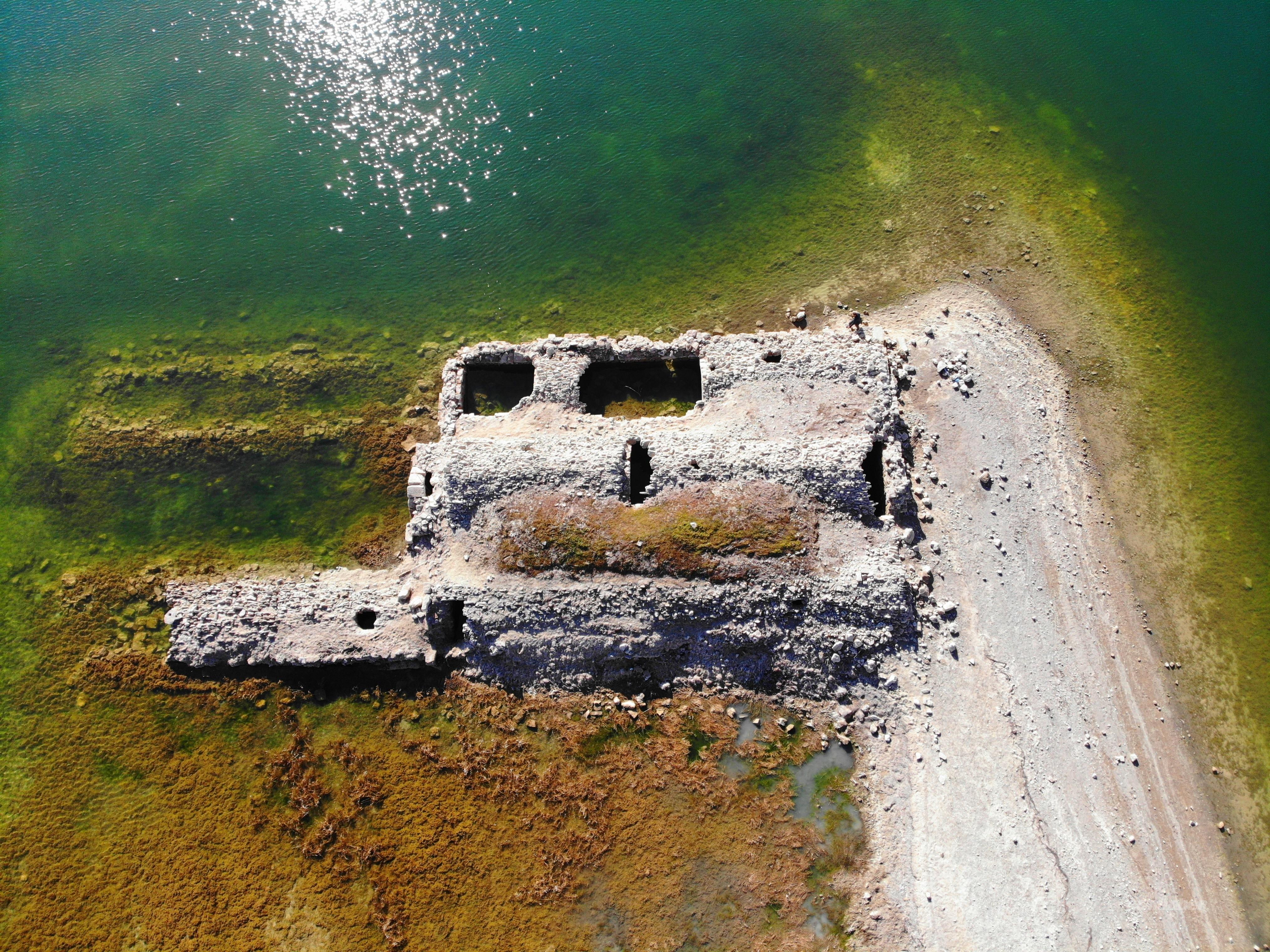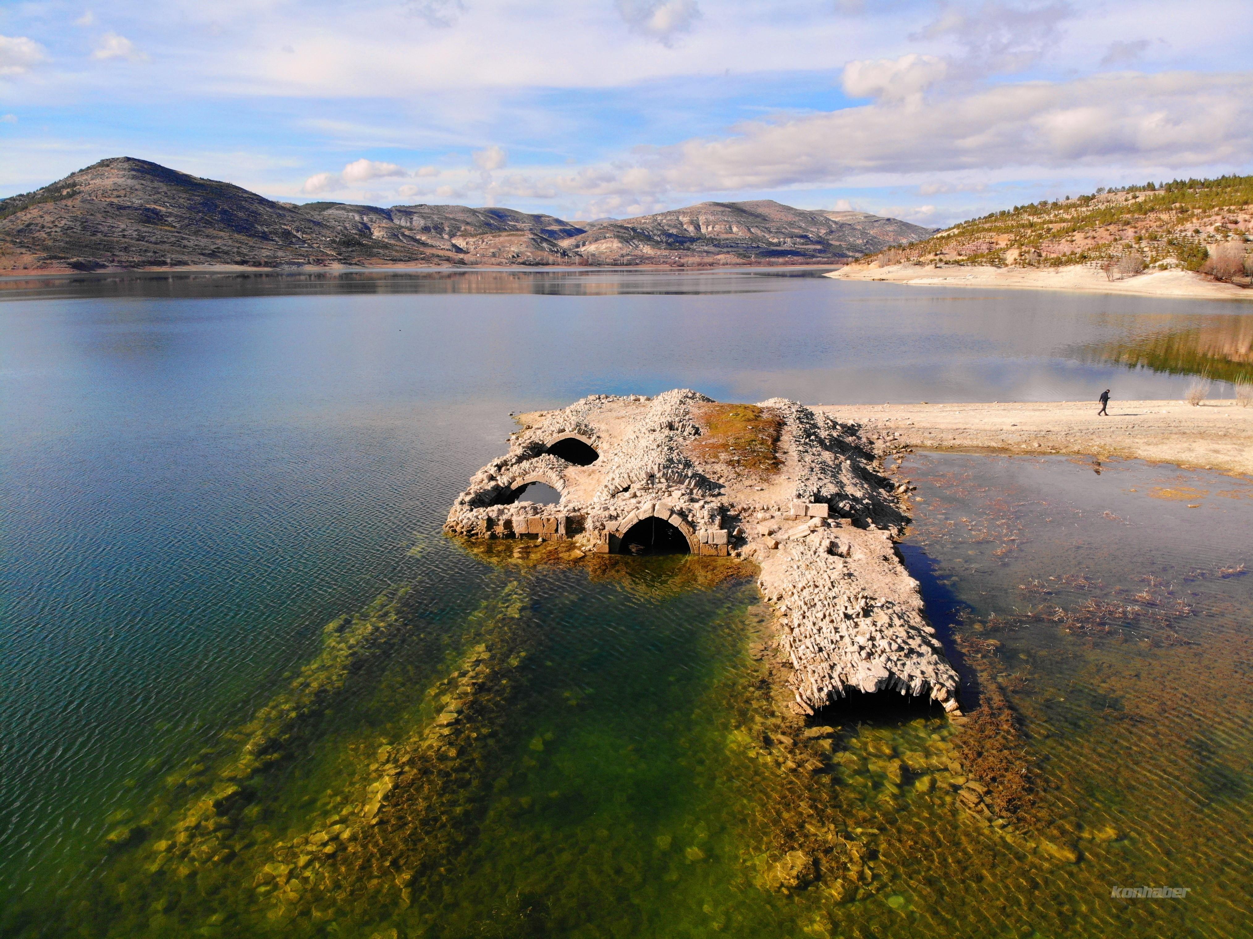 Konya’da 65 yıl önce yapılan Altınapa Barajı’nın suları altında kalan Altınapa Hanı, zaman zaman suların çekilmesiyle görünüyor. Selçuklu dönemine ait han havadan görüntülendi.