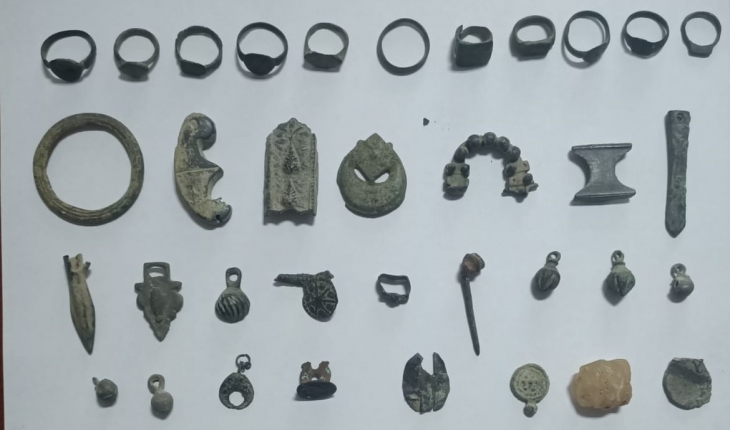 Harekete geçen ekipler, Orhangazi Mahallesi'nde belirlenen adrese yaptığı baskında, 81 Roma sikkesi, 20 obje, 12 yüzük, mühür ve tarihi nitelikte olduğu değerlendirilen taş buldu.