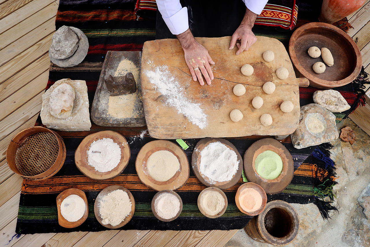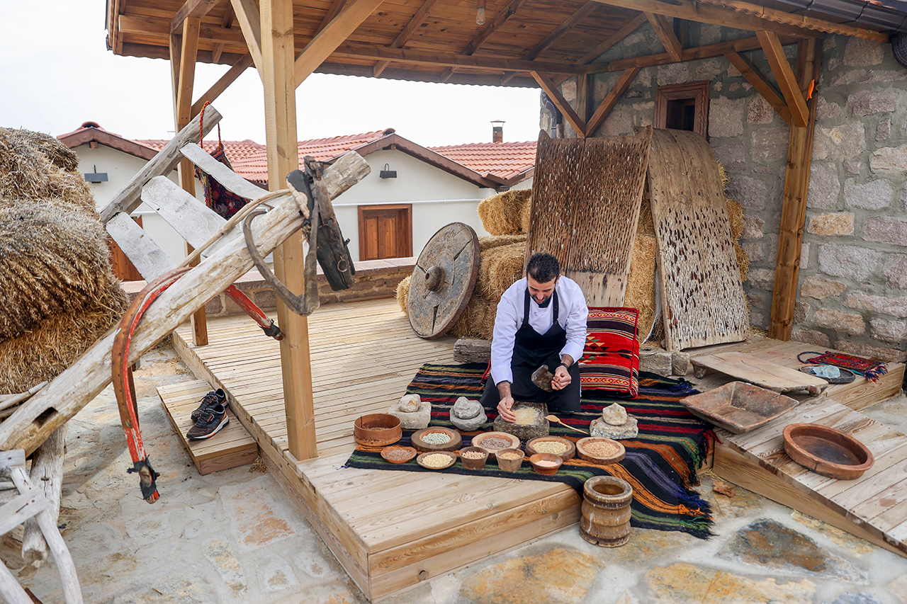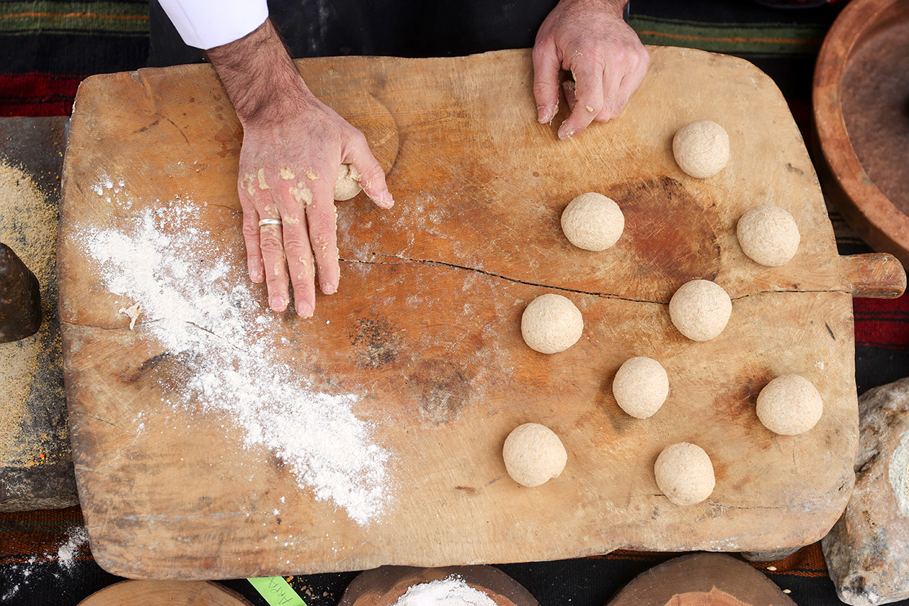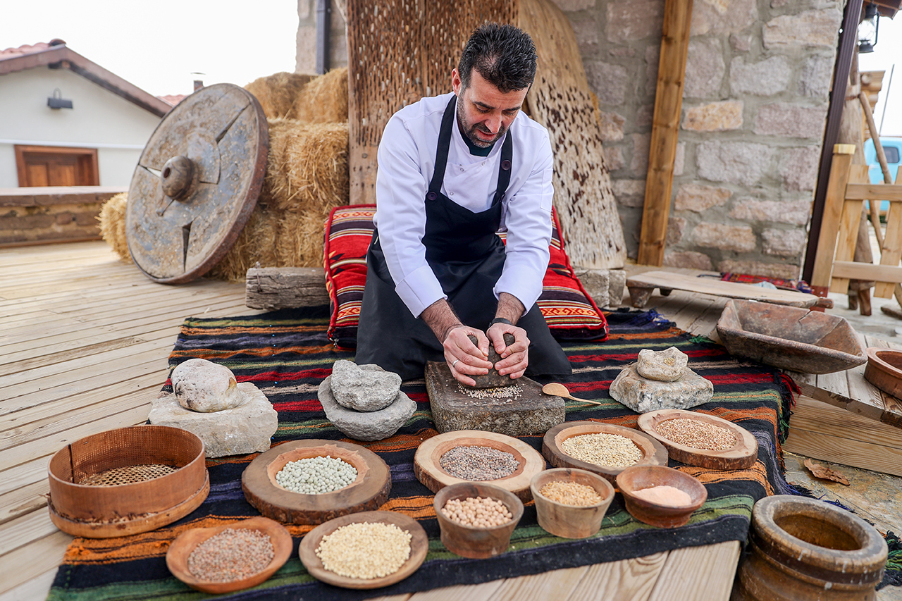 Konya'da Neolitik Çağ yerleşim yeri Çatalhöyük'teki kazıda bulunan ve içeriğindeki tahılların analizlerle tespit edildiği "8 bin 600 yıllık ekmek"ten esinlenen aşçı Ulaş Tekerkaya, bezelye, arpa, buğday ve karaburçaklı ekmek pişirdi.