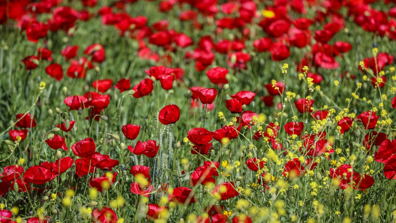 Hatay'ın Kırıkhan ilçesindeki bazı tarlalar, kırmızı renkli gelincik çiçekleriyle doldu.