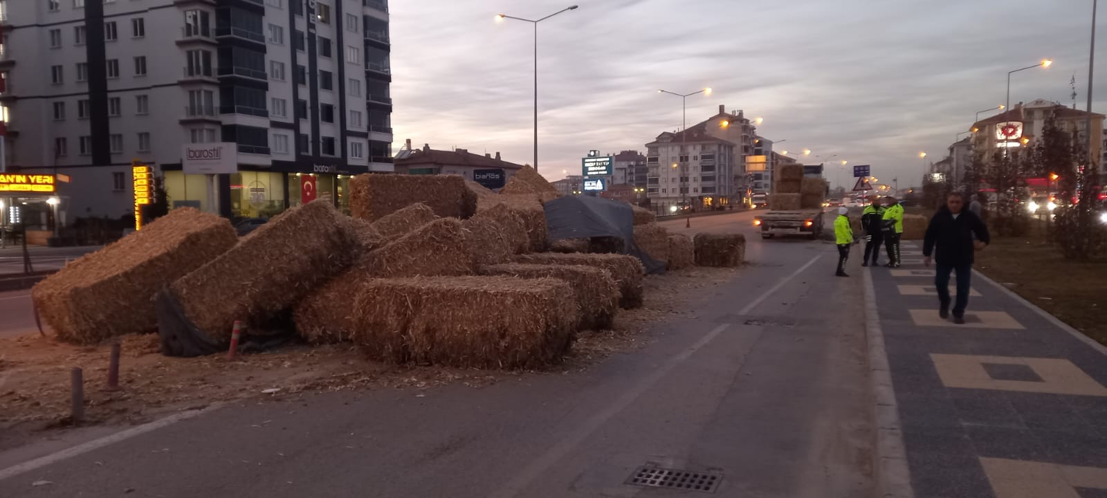 Dün saat 16.30 sıralarında Yenikent Beldesi'nden Kırşehir’e taşınan 68 KF 539 plakalı TIR'ın dorsesinde yüklü balyalar devrilip yola savruldu. Durumu fark eden sürücü de hemen aracını durdurdu.