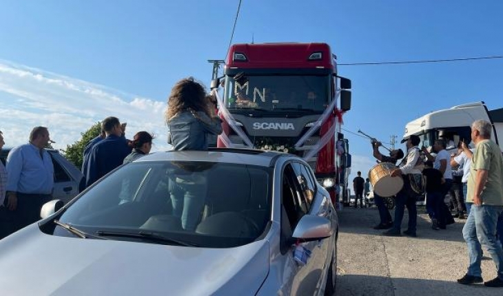 Dorseleri çıkarılan ve süslenen tırlardan birinin direksiyonuna geçen damat Necati ile eşi Melek Fidan, kendisine eşlik eden arkadaşlarının kullandığı diğer tırlarla konvoy halinde cadde ve sokaklardan geçerek Gülüç beldesindeki düğün alanına ulaştı.