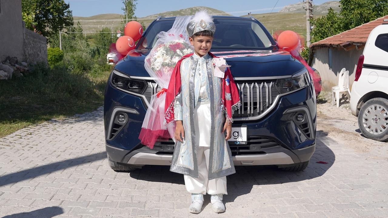 Türkiye'nin yerli ve milli otomobili Togg, Afyonkarahisar'ın Dinar ilçesinde Şehit Jandarma Teğmen Şafak Evran'ın oğlu Uraz'ın sünnet arabası oldu.