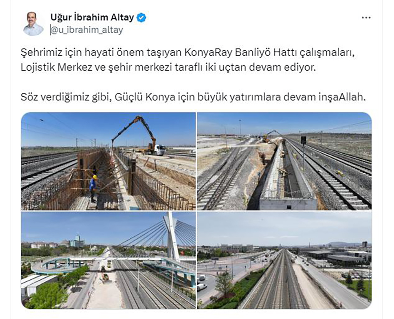 onya Büyükşehir Belediye Başkanı Uğur İbrahim Altay, sosyal medya hesabından yaptığı açıklamada, “Şehrimiz için hayati önem taşıyan KonyaRay Banliyö Hattı çalışmaları, Lojistik Merkez ve şehir merkezi taraflı iki uçtan devam ediyor. Söz verdiğimiz gibi, Güçlü Konya için büyük yatırımlara devam inşallah” dedi.