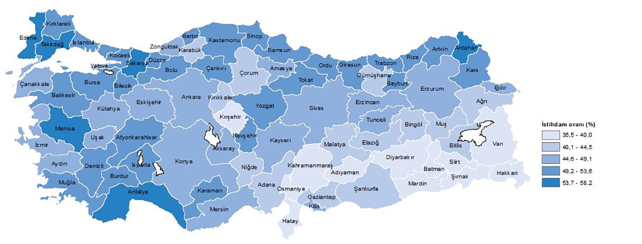 Türkiye genelinde 2023 yılı için istihdam oranı yüzde 48,3 oldu. En yüksek istihdam oranı yüzde 58,2 ile Ardahan'da, en düşük ise yüzde 35,5 ile Siirt'te görüldü.