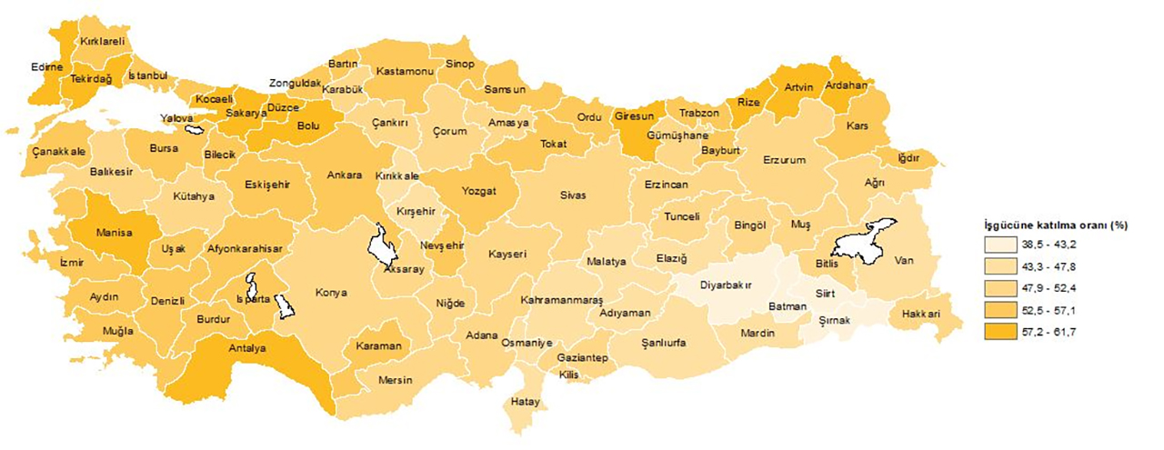 Geçen yıl iş gücüne katılma oranı yüzde 53,3 olarak kayıtlara geçti. Bu kapsamda en yüksek iş gücüne katılma oranı yüzde 61,7 ile Ardahan'da gerçekleşirken, en düşük oran ise yüzde 38,5 ile Siirt'te tespit edildi.