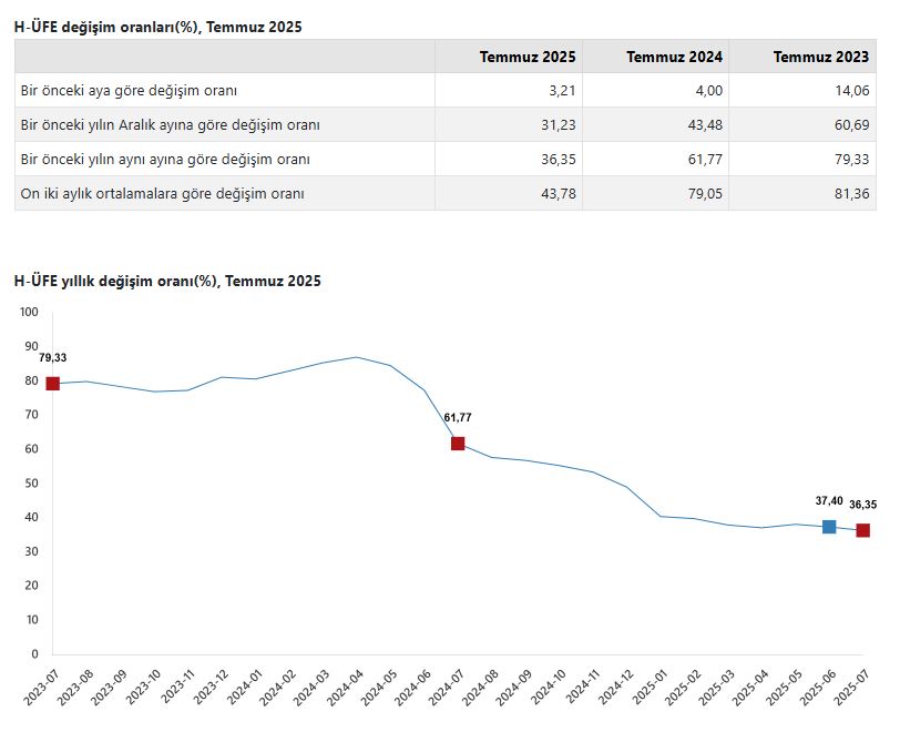 TÜİK, Temmuz 2025 dönemine ilişkin hizmet üretici fiyat endeksi verilerini açıkladı. Buna göre; hizmet üretici fiyatları bir önceki aya göre yüzde 3,21, bir önceki yılın aralık ayına göre yüzde 31,23, bir önceki yılın aynı ayına göre yüzde 36,35 ve 12 aylık ortalamalara göre yüzde 43,78 arttı.