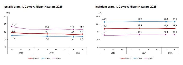 İstihdam edilenlerin sayısı 2025 yılı 2'nci çeyreğinde bir önceki çeyreğe göre 41 bin kişi azalarak 32 milyon 435 bin kişi, istihdam oranı ise 0,2 puanlık azalış ile yüzde 48,9 oldu. Bu oran erkeklerde yüzde 66,1 iken, kadınlarda yüzde 32,1 olarak gerçekleşti. İş gücü, 2025 yılı 2'nci çeyreğinde bir önceki çeyreğe göre 65 bin kişi artarak 35 milyon 469 bin kişi, iş gücüne katılma oranı ise değişim göstermeyerek yüzde 53,5 olarak gerçekleşti. İş gücüne katılma oranı erkeklerde yüzde 71,1, kadınlarda ise yüzde 36,3 oldu.