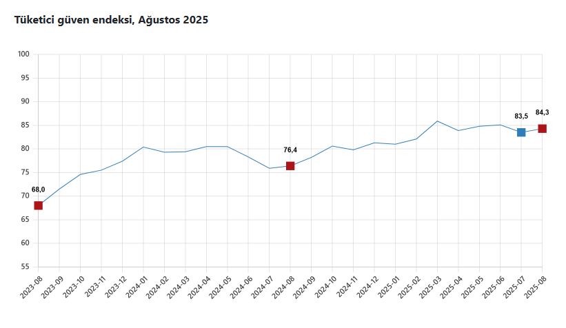 TÜİK, Ağustos 2025 dönemine ilişkin tüketici güven endeksi verilerini açıkladı. Buna göre; tüketici güven endeksi, bir önceki aya göre yüzde 0,9 oranında artarak 84,3 oldu.