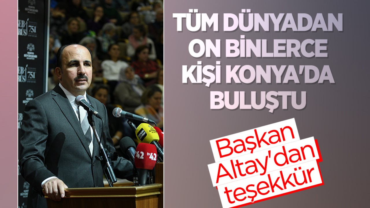 UNESCO’nun İnsanlığın Somut Olmayan Kültürel Mirası Listesi'nde olan Mevlevi Sema Törenlerinin yaşatılmasına ve Mevlana’nın barış mesajlarının tüm dünyaya aktarılmasına büyük katkı sağlayan Cumhurbaşkanı Recep Tayyip Erdoğan’a teşekkür eden Başkan Altay, “751. Vuslat törenleri için Hz. Mevlana’nın ‘Gel’ çağrısını yüreklerinde hissederek Selçuklu dârülmülkü Konya’ya akın eden ülkemizden ve tüm dünyadan misafirlerimize teşekkür ediyorum. Bu anlamlı törenleri gerçekleştiren tüm kurumlarımıza, etkinliklere katkı sağlayan değerli hocalarımıza ve sanatçılarımıza teşekkür ediyorum. Aynı zamanda törenlerin son günü olan Şeb-i Arus’a katılarak bizleri onurlandıran Türkiye Büyük Millet Meclisi (TBMM) Başkanımız Sayın Numan Kurtulmuş’a, Kültür ve Turizm Bakanımız Sayın Mehmet Nuri Ersoy’a da Konyalı hemşehrilerim adına şükranlarımı sunuyorum. Dünyanın içinden geçtiği bu buhranlı zamanlarda Konya olarak Hz. Mevlana’nın hoşgörü ve sevgi mesajlarını dünyaya yaymaktan, barışı ve kardeşliği anlatmaktan vazgeçmeyeceğiz” ifadelerini kullandı. (Yunus Köroğlu)