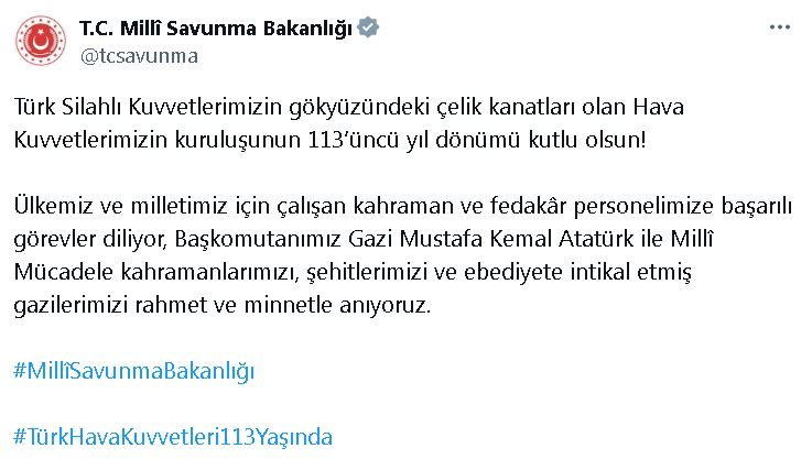 Bakanlığın sosyal medya hesabından yapılan açıklamada, "Türk Silahlı Kuvvetlerimizin gökyüzündeki çelik kanatları olan Hava Kuvvetlerimizin kuruluşunun 113'üncü yıl dönümü kutlu olsun. Ülkemiz ve milletimiz için çalışan kahraman ve fedakar personelimize başarılı görevler diliyor, Başkomutanımız Gazi Mustafa Kemal Atatürk ile Milli Mücadele kahramanlarımızı, şehitlerimizi ve ebediyete intikal etmiş gazilerimizi rahmet ve minnetle anıyoruz" denildi.