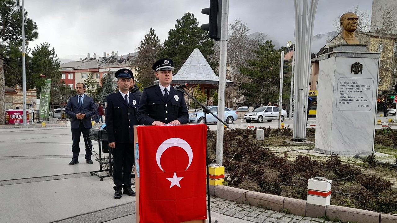 Atatürk Anıtı'na çelenk bırakılmasıyla başlayan merasim saygı duruşu ve İstiklal Marşı'nın okunmasıyla sürdü.Programda konuşan İlçe Emniyet Müdürlüğünde görevli Komiser Yardımcısı Abdulkadir Soykan, Türk Polis Teşkilatı'nın halkın mal ve can güvenliğinin sağlamasının yanı sıra ülkedeki huzur ve güven ortamının tesisinde büyük rol üstlendiğini söyledi.