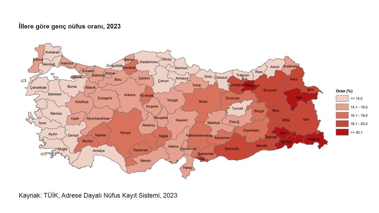 ADNKS sonuçlarına göre 2023'te genç nüfus oranının en yüksek olduğu il yüzde 21,5 ile Hakkari oldu. Bunu yüzde 21,1 ile Şırnak ve Siirt, yüzde 20,2 ile Bayburt izledi. Genç nüfus oranının en düşük olduğu il yüzde 12,1 ile Balıkesir oldu. Bu ili yüzde 12,2 ile Muğla ve yüzde 12,4 ile Ordu izledi.