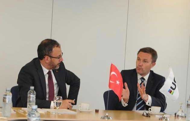 Bakanlıktan yapılan açıklamaya göre, Konya'da inşa edilmesi planlanan Türkiye'nin ilk kapalı veledromu için İsviçre'de bulunan Kasapoğlu, Uluslararası Bisiklet Birliği (UCI) Başkanı David Lappartient ve UCI Genel Müdürü Amina Lanaya ile bir araya geldi.