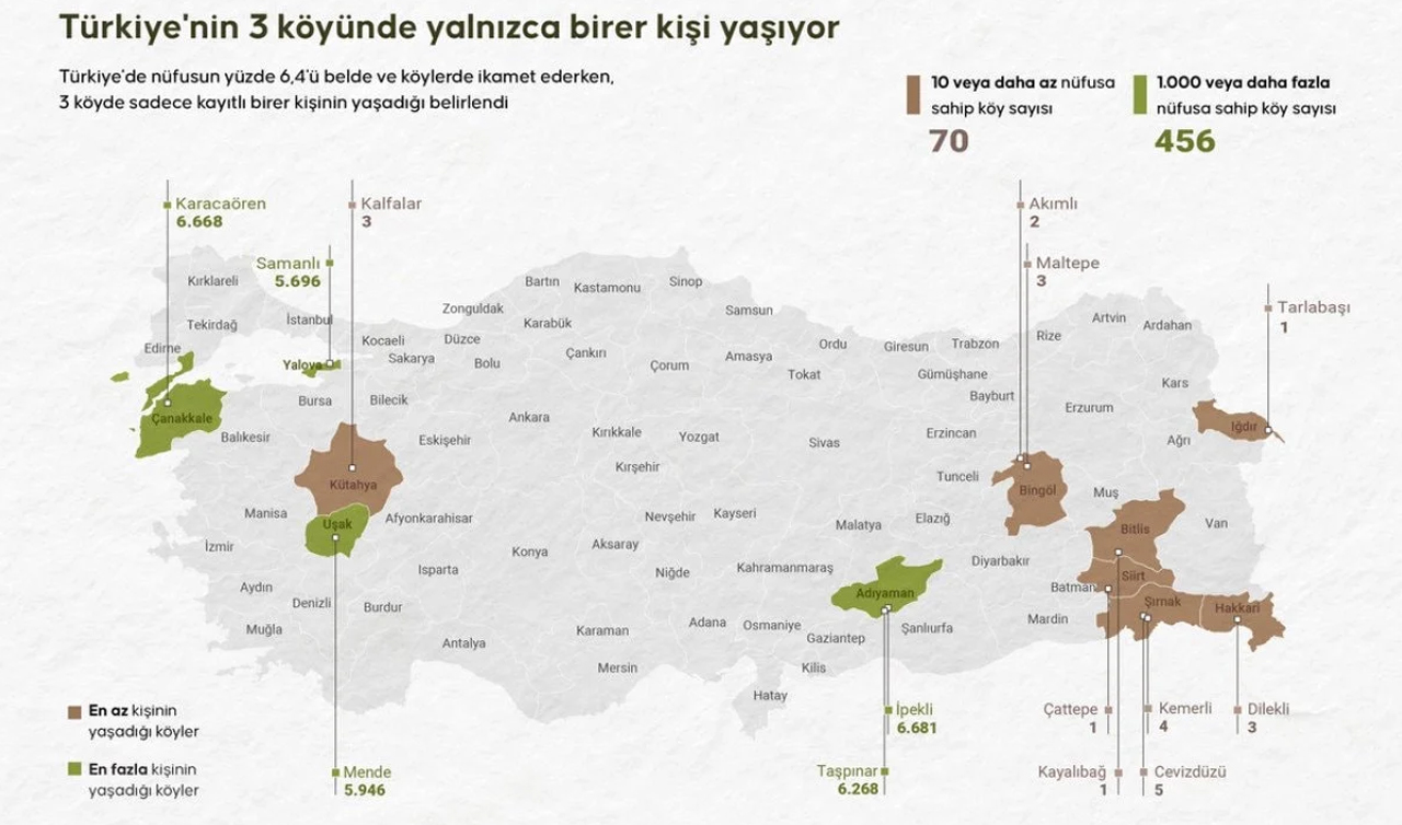 Türkiye'de nüfusun yüzde 6,4'ü belde ve köylerde ikamet ederken, 70 köyde nüfusa kayıtlı 10 veya daha az kişinin yaşadığı belirlendi. Yeni verilere göre Türkiye'nin 3 köyünde yalnızca birer kişi yaşıyor.