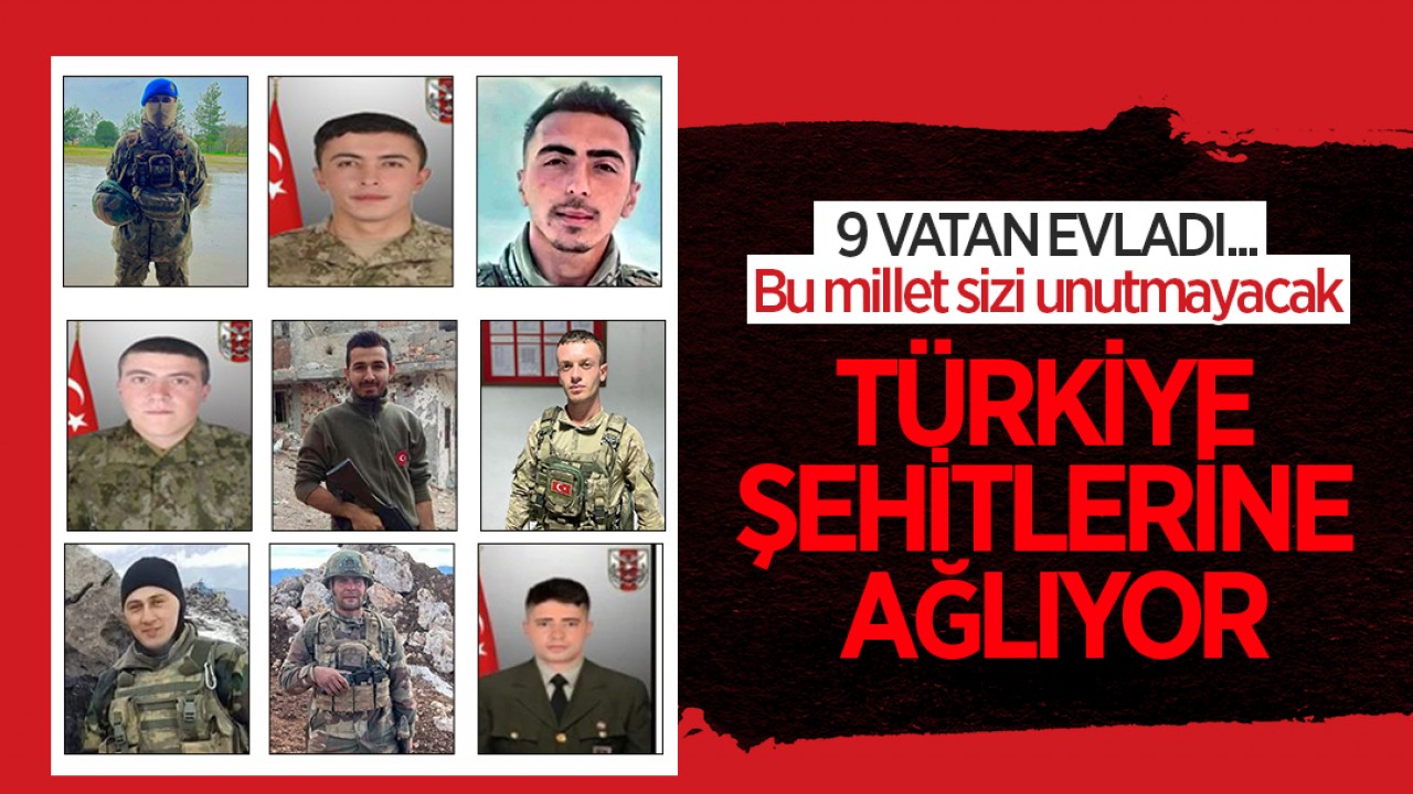 Dün gece gelen şehit haberleri Türkiye'yi yasa boğdu.. Irak'ın kuzeyindeki Pençe-Kilit Harekatı bölgesinde teröristler tarafından gerçekleştirilen saldırıda 9 Mehmetçik şehit düştü. Şehitlerimizin baba evlerine şehadet haberi verildi. Evlerin her biri Türk bayraklarıyla donatıldı.