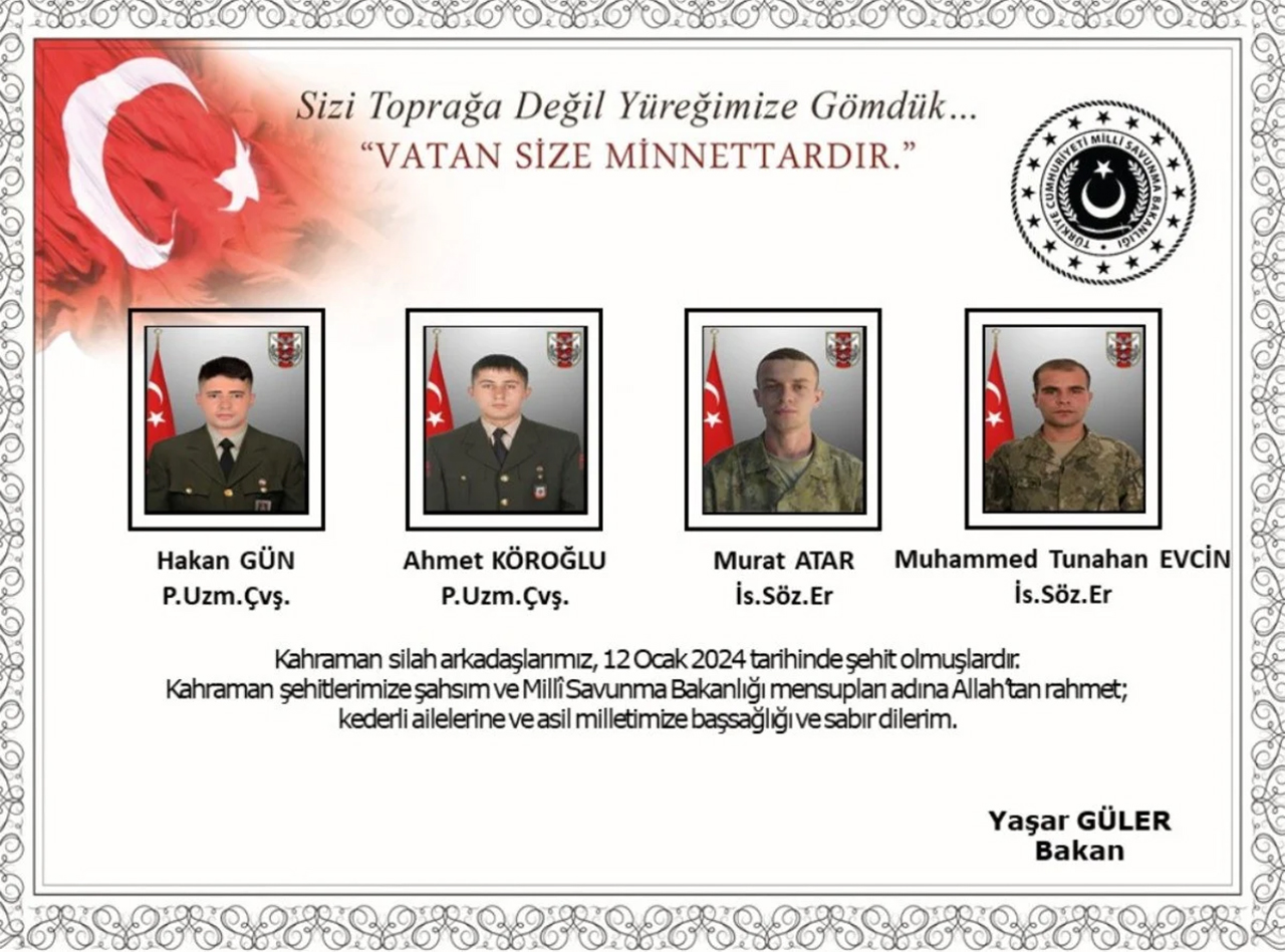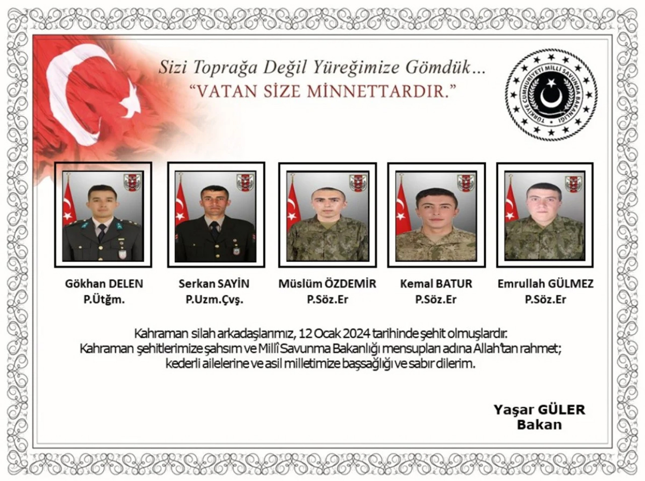 MSB, Pençe-Kilit Harekâtı bölgesindeki askeri üslere sızmaya çalışan teröristlerle çıkan çatışmada şehit olan 9 askerin isimlerini açıkladı. Bakanlık tarafından yapılan açıklamaya göre, teröristlerle çıkan çatışma sonucu şehit düşen askerler şu şekilde: