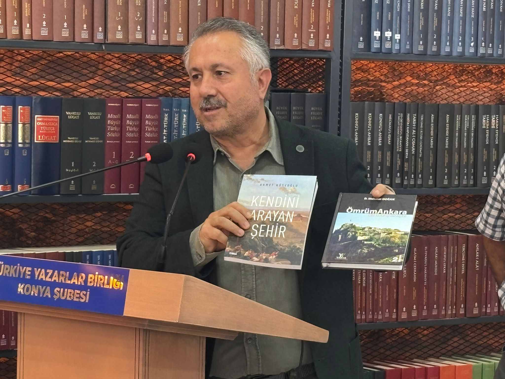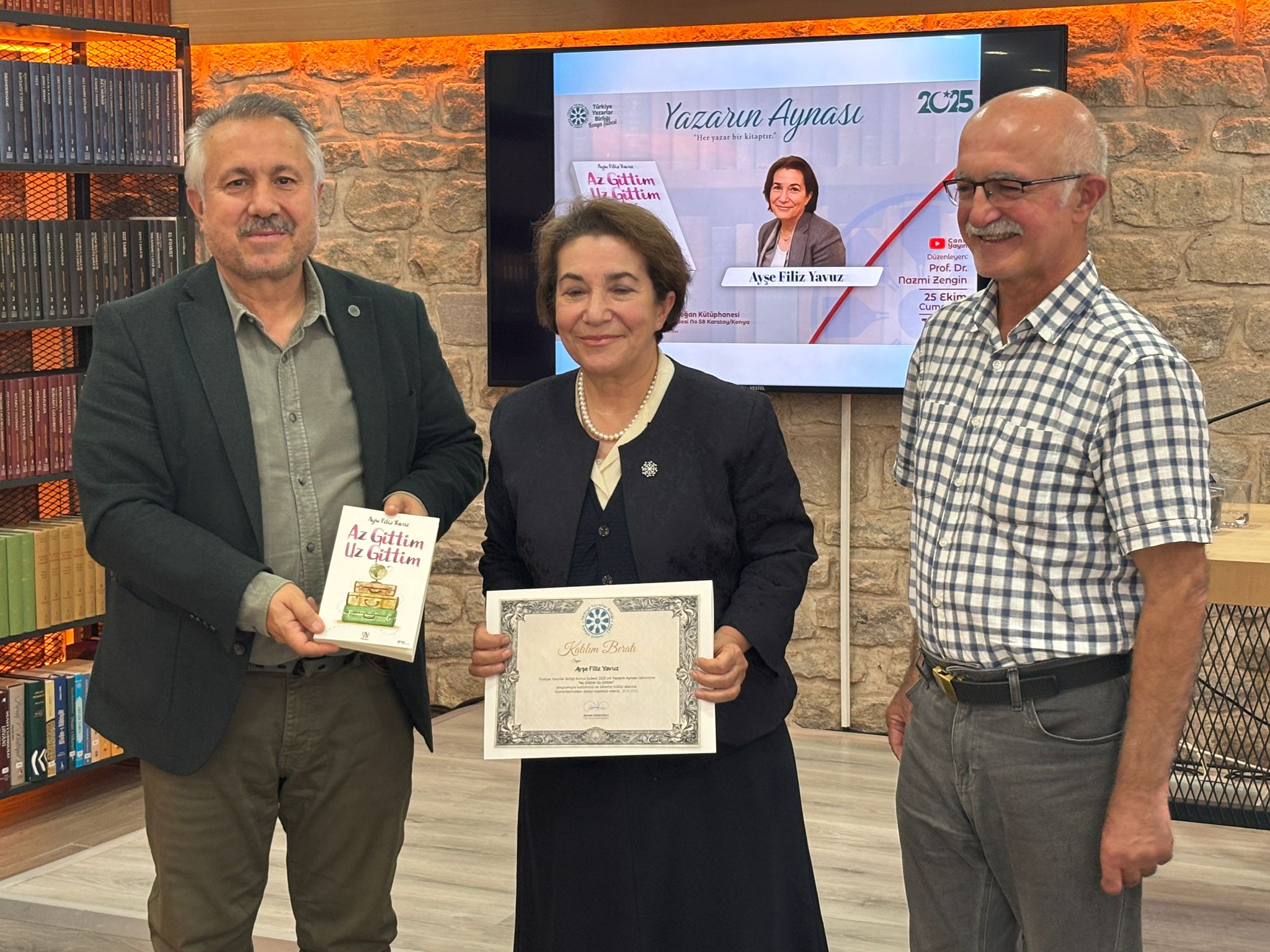 Program, soru-cevap bölümünün ardından sona erdi. TYB Konya Şube Başkanı Ahmet Köseoğlu, Yazar Prof. Dr. Ayşe Filiz Yavuz’a Katılım Belgesi ile birlikte D. Mehmet Doğan’ın Ömrüm Ankara ve kendi eseri Kendini Arayan Şehir adlı kitaplarını takdim etti. Etkinlik, çekilen hatıra fotoğrafı ile tamamlandı. (Veli Şengül)