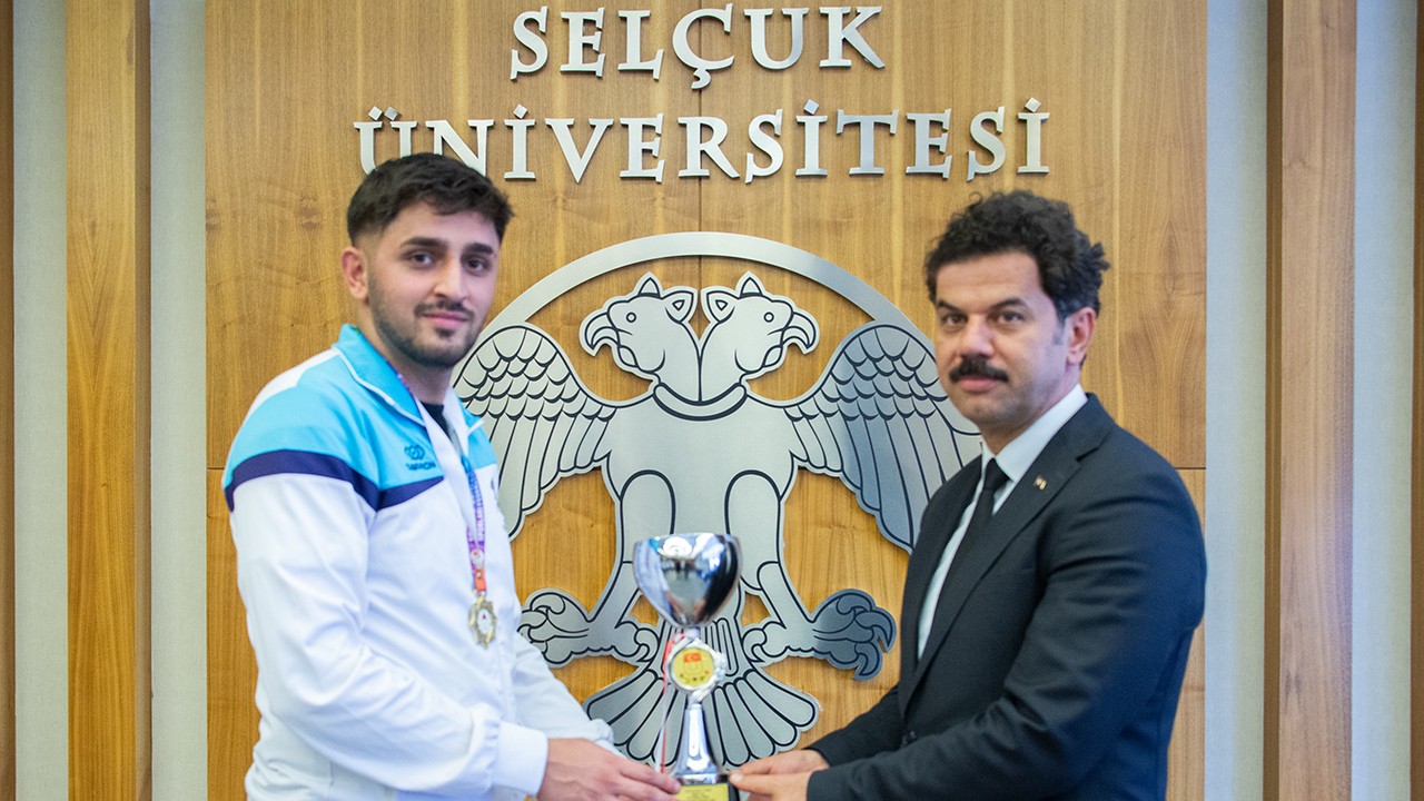 Ziyaretten duyduğu memnuniyeti ifade eden Rektör Prof. Dr. Hüseyin Yılmaz, Selçuk Üniversitesinin 70 bine yakın öğrencisi, 8 bin personeli ve 392 bini aşkın mezunu ile büyük bir eğitim kurumu olduğunu söyledi. Öğretim elemanı ve öğrencilerin birçok alanda başarılar elde etmeye devam ettiğini ifade eden Prof. Dr. Yılmaz, “Üniversite olarak sonuna kadar arkanızdayız. İmkanlarımız ölçüsünde desteğimizi sürdüreceğiz. Nasip olur inşallah, yine Üniversitemizi başarılı bir şekilde temsil edersiniz. Hem kendi hayatınızda, kariyerinizde güzel bir alan hem de Üniversitemiz için kariyer planlamasında güzel bir alan oluşturmuş olursunuz” diye konuştu.