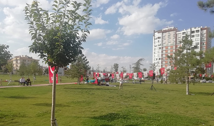 İzinsiz ve yasa dışı etkinlikte Saadetliler tarafından vatandaşların şaşkın bakışları altında Şefikcan Parkı'na parti bayrak ve flamaları asılırken ses sistemi ve yayın aracı kuruldu.