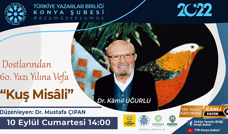 TYB Konya Şubesi Başkanı Ahmet Köseoğlu 10 Eylül Cumartesi günü, Uğurlu ailesinden Meram Belediyesine intikal eden Tantavi Kültür Merkezinde, 10 Eylül Cumartesi günü Saat 14.00’de Kâmil Uğurlu’nun 60. Yazı Yılına vefa olarak bir program tertip ettiklerini ve Kuş Misali adlı kitabı da bu programda katılımcılara hediye edeceklerini söyledi. Köseoğlu “Yazılarıyla ve hazırladığı şehrengiz kitaplarıyla kültür dünyamıza önemli hizmetleri olan Kâmil Uğurlu’yu bu programda dostlarının anlatımıyla dinleyeceğiz. TYB Konya Şubesi olarak şehre değer katan kültür insanlarına vefamızı göstermeye devam edeceğiz” diye konuştu.