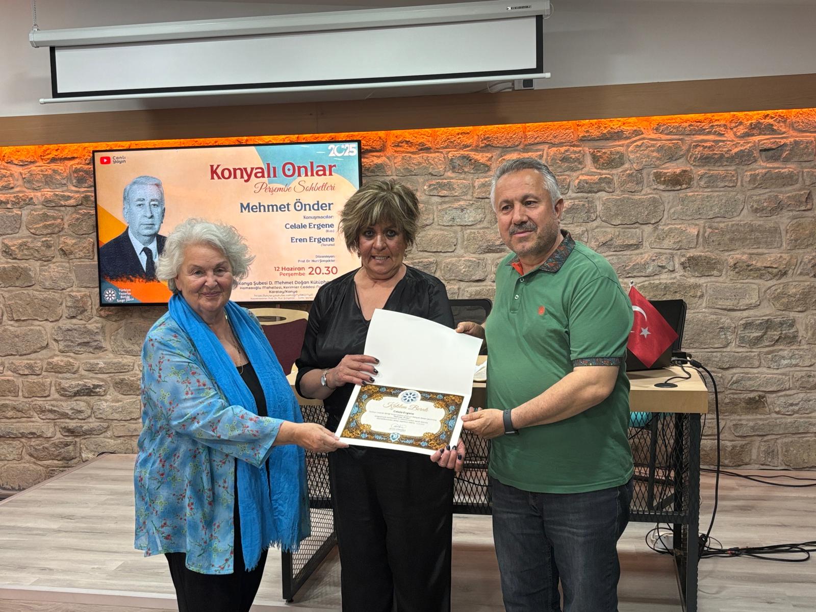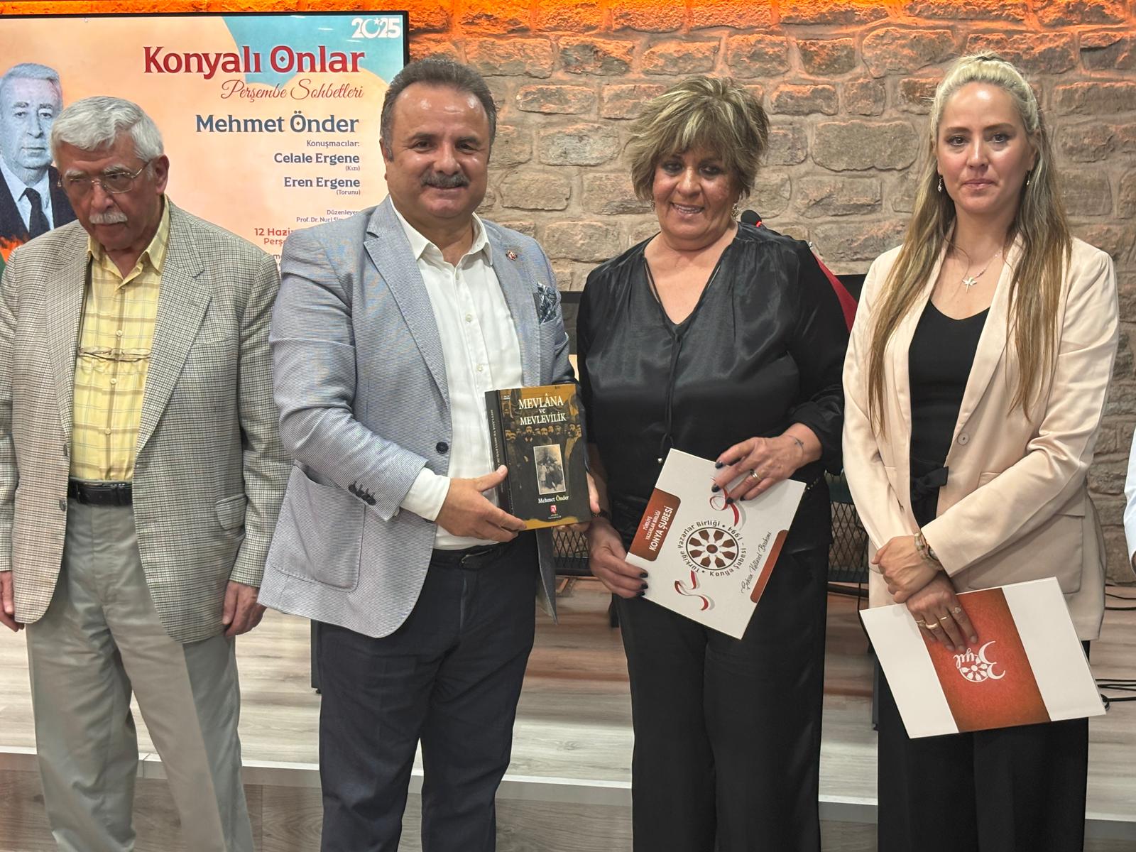 Kültür ve sanat dünyasına unutulmaz hizmetlerde bulunmuş merhum Dr. Mehmet Önder, vefatının ardından ailesinin ve sevenlerinin katılımıyla Türkiye Yazarlar Birliği (TYB) Konya Şubesi D. Mehmet Doğan Kütüphanesi’nde düzenlenen özel bir vefa programıyla anıldı. Prof. Dr. Nuri Şimşekler’in sunduğu programda, Önder’in kızı Celale Ergene ve torunu Eren Ergene, değerli kültür insanını kendi anılarıyla anlattı.