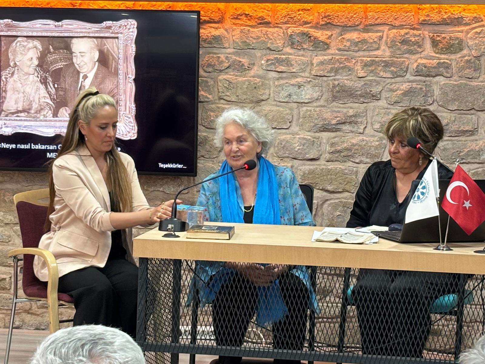 Program sonunda konuşmacılara katılım beratlarını TYB Konya Şubesi Ahmet Köseoğlu, Hattat Hüseyin Ösküz, Esin Çelebi Bayru, Postnişîn Fahri Özçakıl, Salih Sedat Ersöz takdim ederken Celale Ergene de Prof. Dr. Nuri Şimşekler’e Mehmet Önder’in “Mevlâna ve Mevlevilik” kitabını armağan etti. (Veli Şengül)