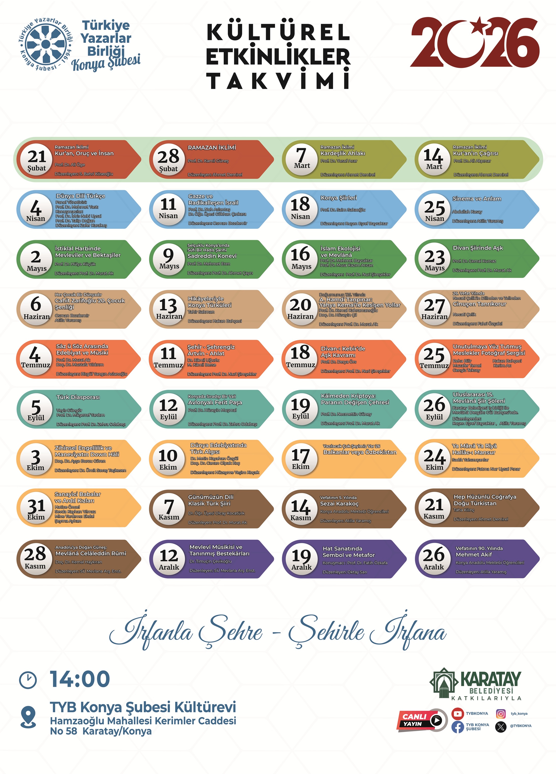 Yıl boyunca sürecek olan Kültürel Etkinlikler takvimi; sanattan sosyolojiye, ekonomiden tasavvufa ve edebiyata kadar geniş bir yelpazeyi kapsıyor. Bu kapsamlı takvimde kürsüye çıkacak ve birikimlerini paylaşacak isimler arasında; Prof. Dr. Ali Öge, Prof. Dr. Kamil Güneş, Prof. Dr. Yusuf Acar, Prof. Dr. Ali Akpınar, Prof. Dr. Mehmet Yazıcı, Prof. Dr. İdris Nebi Uysal, Prof. Dr. Talip Doğan, Prof. Dr. Nuh Arslantaş, Dr. Öğr. Üyesi Gökhan Çınkara, Prof. Dr. Saim Sakaoğlu, Abdullah Kasay, Prof. Dr. Hülya Küçük, Prof. Dr. Mehmet Eren, Prof. Dr. Mehmet Bayraktar, Prof. Dr. Musa Kazım Arıcan, Prof. Dr. Cemal Kurnaz, Osman Bozdemir, Atilla Yaramış, Tahir Sakman, Prof. Dr. Kemal Kahramanoğlu, Doç. Dr. Hüseyin Çil, Necati Çelik, Prof. Dr. Murat Ak, Doç. Dr. Mustafa Yıldırım, Dr. Kamil Uğurlu, M. Kamil Berse, Prof. Dr. Derya Örs, Reha Bilir, Hakan Bahçeci, Muzaffer Temel, Kerim Arı, Cengiz Teksoy, Veyis Güngör, Prof. Dr. Müşerref Yardım, Prof. Dr. Hüseyin Muşmal, Prof. Dr. Necmettin Güney, Doç. Dr. Ayşe Burcu Gören, Dr. Metin Kayahan Özgül, Doç. Dr. Canan Olpak Koç, Sadık Yalsızuçanlar, Hatice Öncel, Sevda Kayhan Yılmaz, Mine Yardımcı Ekdal, Şeyma Ayhan, Dr. Öğr. Üyesi Olcay Kocatürk, Konya Anadolu Mektebi Öğrencileri, Taha Kılınç, Doç. Dr. Kemal Haykıran, Dr. Timuçin Çevikoğlu ve Prof. Dr. Fatih Özkafa gibi çok değerli akademisyen, yazar ve sanatçılar yer alıyor.
