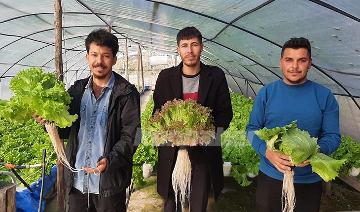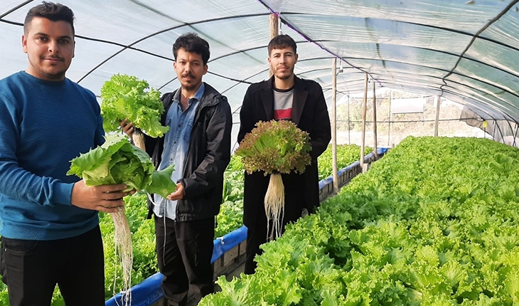 Osmaniye'nin Sumbas ilçesinde yaşayan üç genç arkadaş bir araya gelerek köylerinde kurdukları serada topraksız tarım yapıp marul yetiştiriyor.