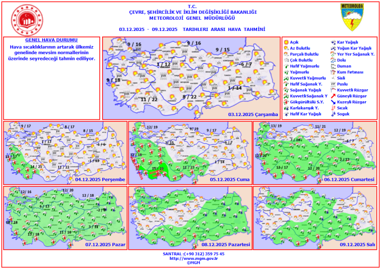 Rüzgarın genellikle güneyli, Akdeniz ve Güneydoğu Anadolu'da kuzeyli yönlerden hafif, ara sıra orta kuvvette esmesi bekleniyor.
