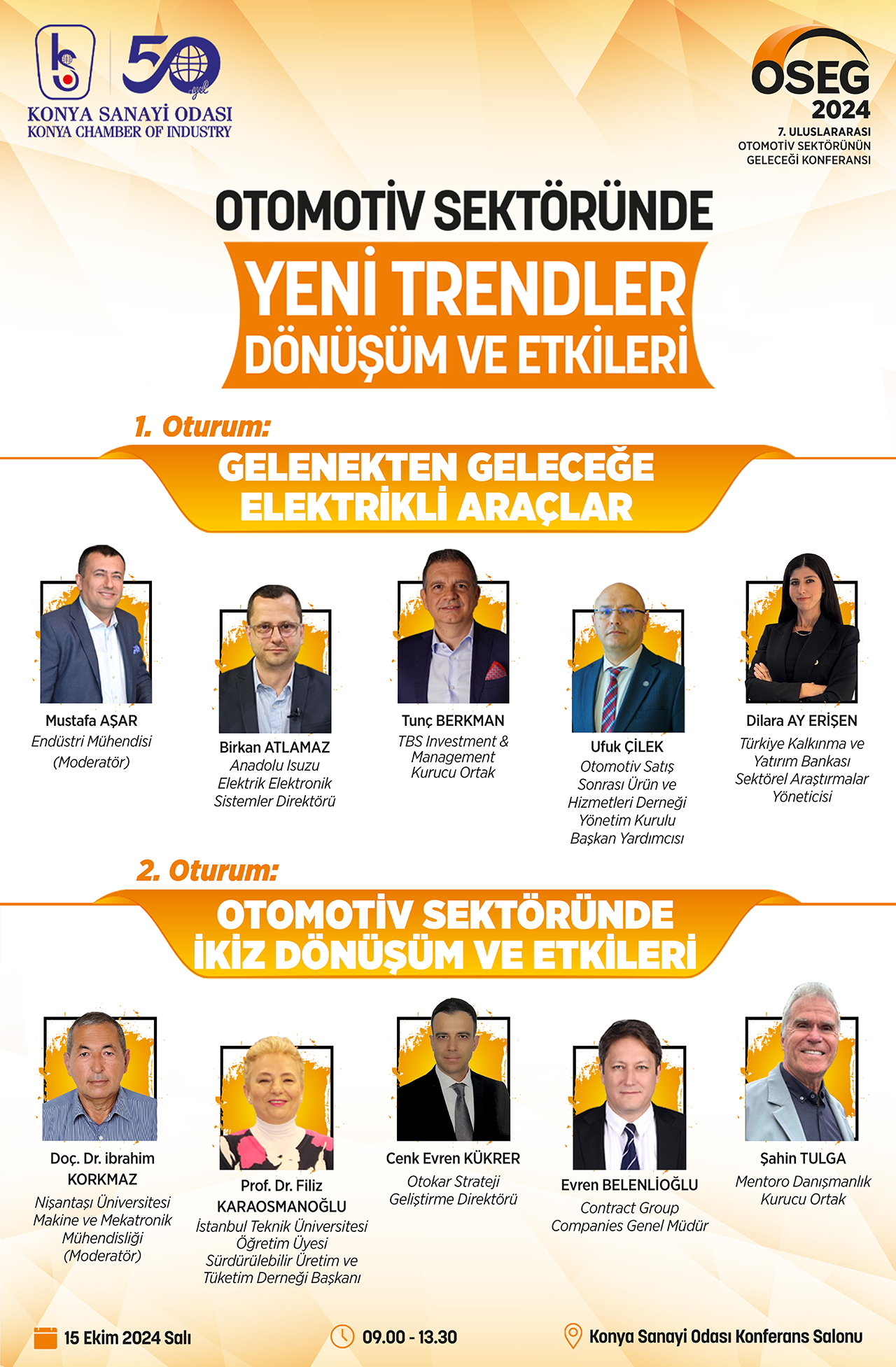 Konya Sanayi Odası (KSO) tarafından düzenlenen, otomotiv sektörünün vizyon buluşması Uluslararası Otomotiv Sektörünün Geleceği (OSEG) Konferanslarının bu yıl 7.’si gerçekleştirilecek. Konya Sanayi Odası Başkanı Mustafa Büyükeğen, 7. OSEG Konferansında otomotiv sektöründeki yeni trendlerin ve dönüşümün tüm yönleriyle konuşulacağını söyleyerek, sektör sanayicilerini ve ilgi duyan herkesi konferansa davet etti.