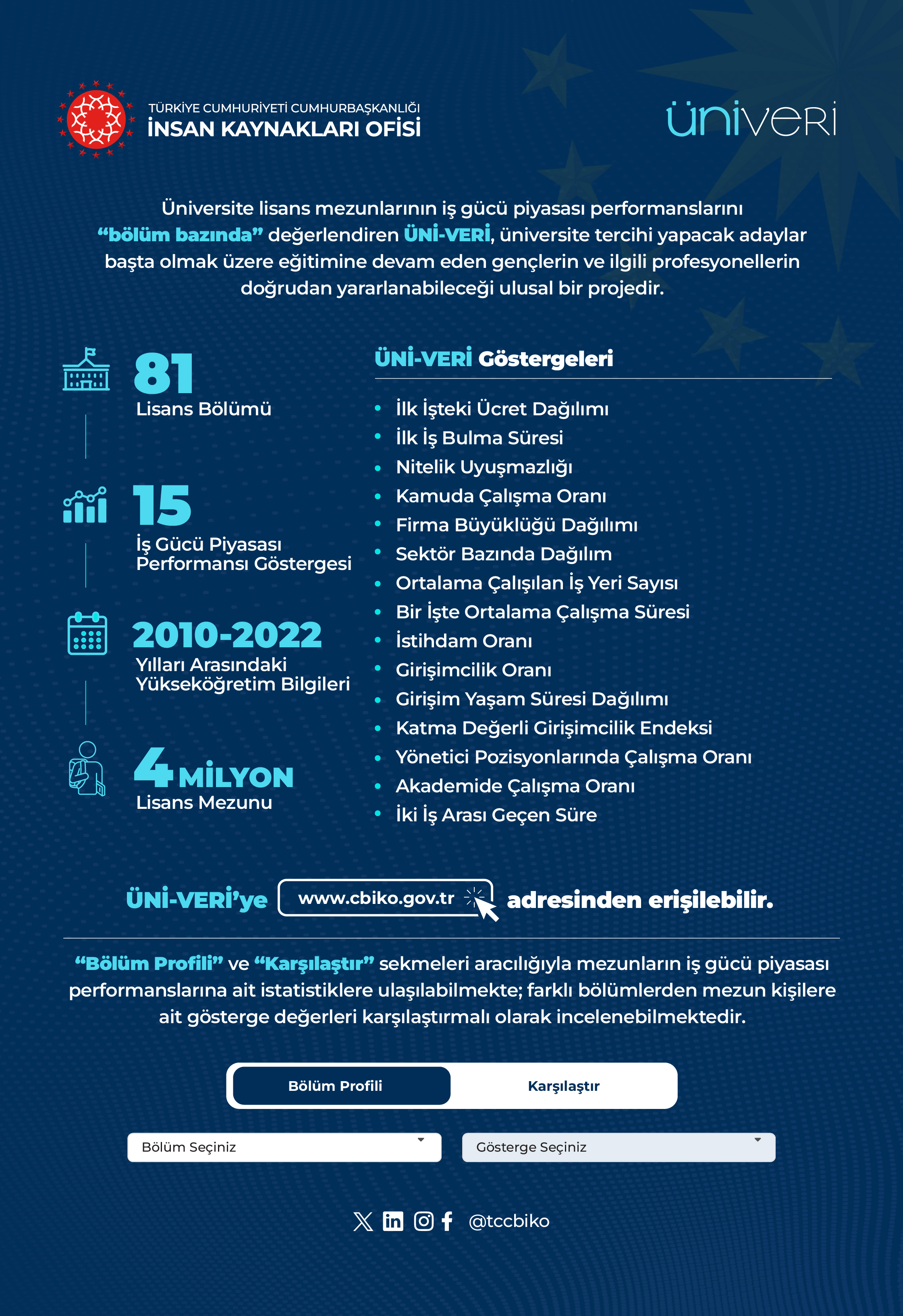 Bölümlerin iş gücü piyasalarındaki performansı hakkında güncel ve nitelikli bilgiler sunan ÜNİ-VERİ, OECD gibi uluslararası çatı kuruluşlar tarafından Türkiye'deki eğitim ve iş gücü piyasası reformlarına olan katkılarıyla iyi uygulama örneği olarak gösterildi. Tüm kamuoyuna açık ve ücretsiz hizmet sunan ÜNİ-VERİ, öğrenciler ve velilerine ek olarak eğitim kurumları, kariyer danışmanları ve akademisyenler için de kılavuz niteliği taşıyor. Yükseköğretim ile istihdam piyasası arasındaki bağlantıyı kuvvetlendirmeyi hedefleyen ÜNİ-VERİ’ye (www.cbiko.gov.tr) adresinden ulaşılabiliyor. Duyurular ise Cumhurbaşkanlığı İnsan Kaynakları Ofisi resmi hesaplarından yapılıyor.