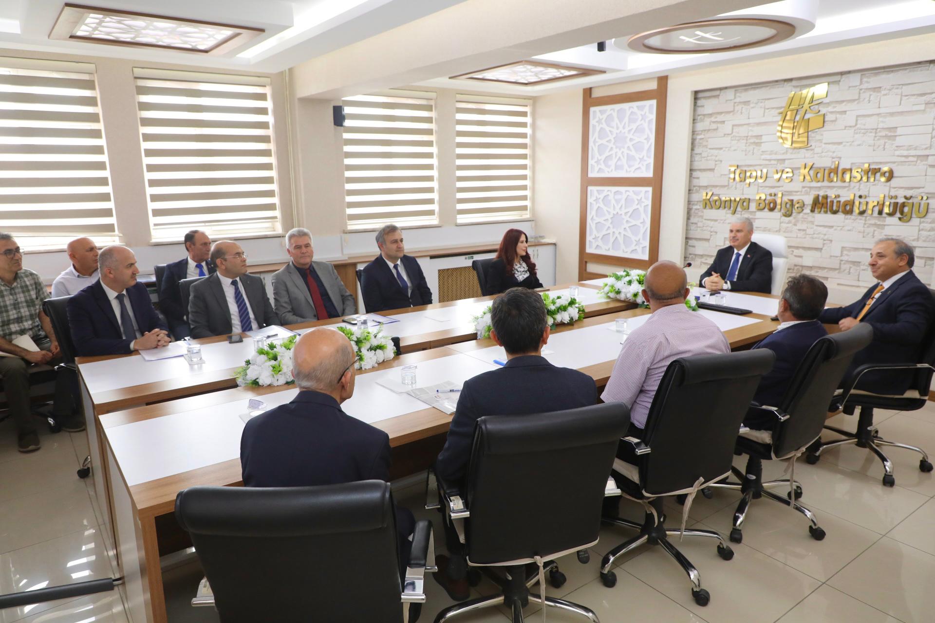 Konya Tapu ve Kadastro V. Bölge Müdürlüğü ziyareti kapsamında Vali İbrahim Akın başkanlığında; Vali Yardımcısı Fatmagül Dalmış, Konya Tapu ve Kadastro V. Bölge Müdürü Ömer Ay, merkez ilçe tapu müdürleri ve şube müdürleri ile kurumun ildeki faaliyetleri hakkında bir değerlendirme toplantısı gerçekleştirildi.(Yunus Köroğlu)