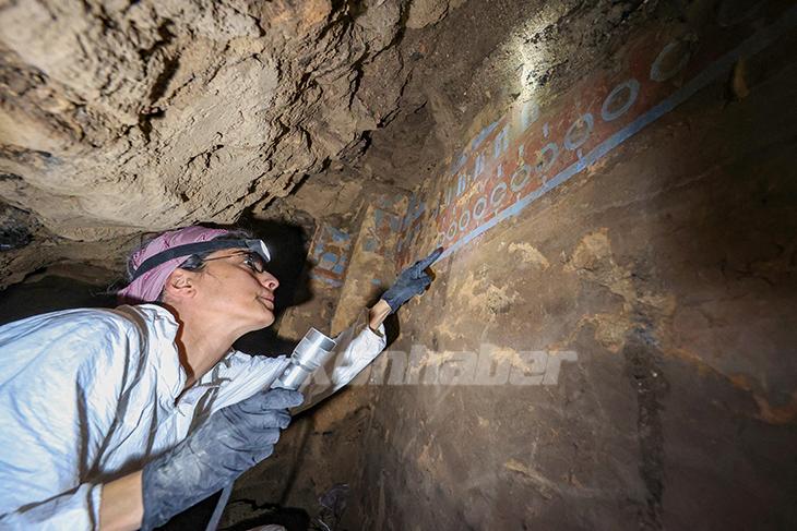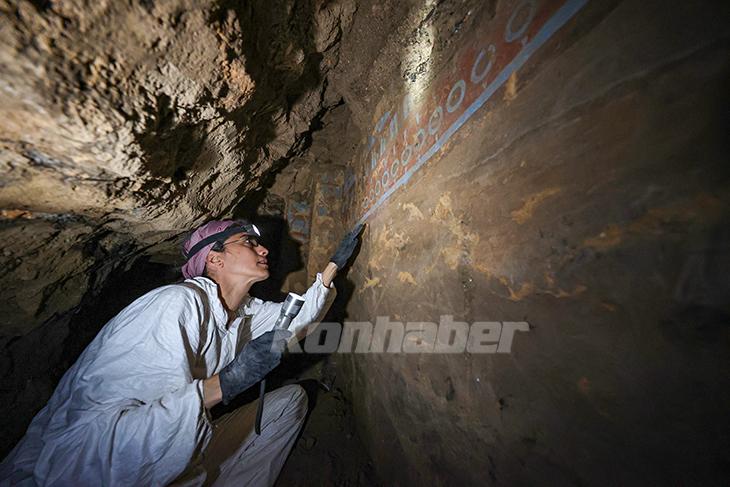 Kazıya başlamadan önceki tüm tespitleri ve belgeleme çalışmalarını yaptıklarını belirten Cihan, şu bilgileri verdi: "Kazı ekibiyle eşzamanlı bir çalışma yürütüyoruz. Uzun koridorlar var. Çok dar mekanlar var. Küçük bölümde resimler var. Korunması gereken en önemli bölüm resimler ve kerpiç duvarlar. Resimler üç bölümden oluşuyor. Her bölümde farklı bezemeler var. Ortasında desen içinde bir insan figürü var. Yanında da mitolojik olabileceği düşünülen bezemeler yer alıyor. Bezemelerde üç renk kullanımını tespit ettik. Buradan örnekler alıp, laboratuvar ortamında gerekli incelemelerini yapacağız."