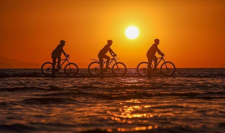Van'da bisiklet tutkunları, su seviyesindeki düşüşe dikkati çekmek amacıyla Van Gölü'nün kıyılarında oluşan adacıklarda bisiklet sürdü, yürüyüş yaptı.