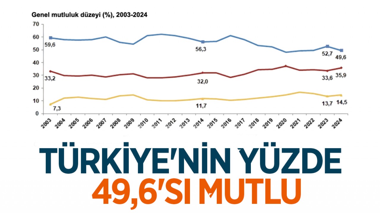 Yaşam Memnuniyeti Araştırması sonuçlarına göre, mutlu olduğunu beyan eden 18 ve üzeri yaştaki bireylerin oranı, 2023 yılında yüzde 52,7 iken 2024 yılında 3,1 puan azalarak yüzde 49,6 oldu.