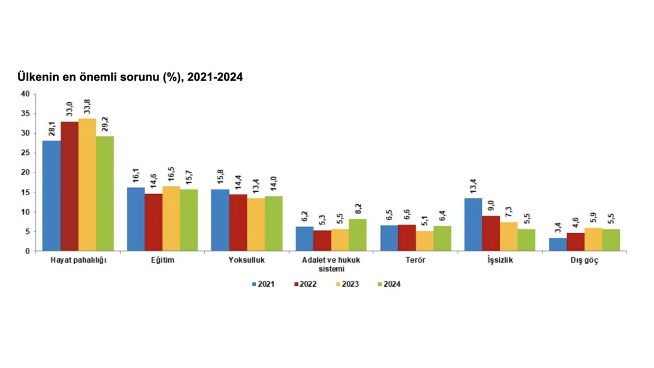 Ülkenin en önemli sorunu incelendiğinde; 2024 yılında hayat pahalılığı yüzde 29,2 ile ilk sırada yer alırken yüzde 15,7 ile eğitim ikinci sırada ve yoksulluk yüzde 14 ile üçüncü sırada yer aldı.