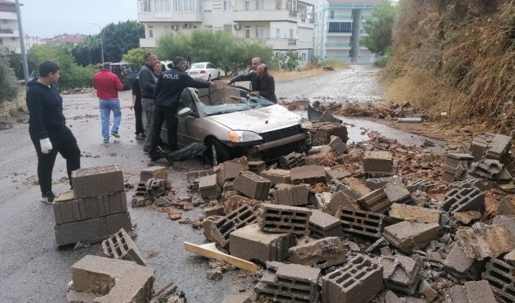 Antalya'nın Manavgat ilçesinde depo olarak kullanılan bir binanın istinat duvarı, park halindeki otomobilin üzerine yıkıldı. Aşırı yağmur ve dolunun etkisiyle yıkılan istinat duvarı, otomobilin yanı sıra yola saçılırken, yolda kimsenin olmaması faciayı önledi. Duvarın yıkılması sonucu hurdaya dönen otomobili, Ersan Karataş isimli vatandaşın, hastası olduğu için arkadaşından emanet aldığı bildirildi.