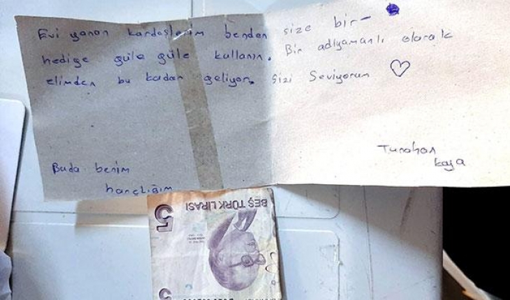 Adıyaman'dan yardım gönderen Tunahan Kaya, 5 lira koyduğu notunda, "Evi yanan kardeşlerim benden size bir hediye, güle güle kullanın. Bir Adıyamanlı olarak elimden bu kadar geliyor. Sizleri seviyorum. Bu da benim harçlığım" paylaşımı çıktı.
