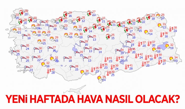 En yüksek sıcaklık değerleri Konya'da 18-28, Ankara'da 27-29, İstanbul'da 28-31, Muğla'da 39-42, Diyarbakır'da 40-42, Samsun'da 27-28, İzmir'de 34-37, 36-40 derece civarında seyredecek.