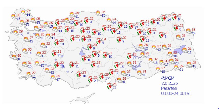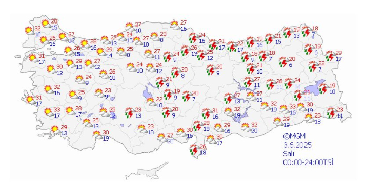 İç ve Doğu Akdeniz, İç Anadolu, Batı Karadeniz’in iç kesimleri, Orta ve Doğu Karadeniz, Doğu Anadolu’nun kuzeyi ile Afyonkarahisar ve Malatya çevrelerinin sağanak ve gök gürültülü sağanak yağışlı geçecek. 3 Haziran Salı günü ise yağışların, Ordu ve Giresun çevrelerinde yerel kuvvetli olması bekleniyor.