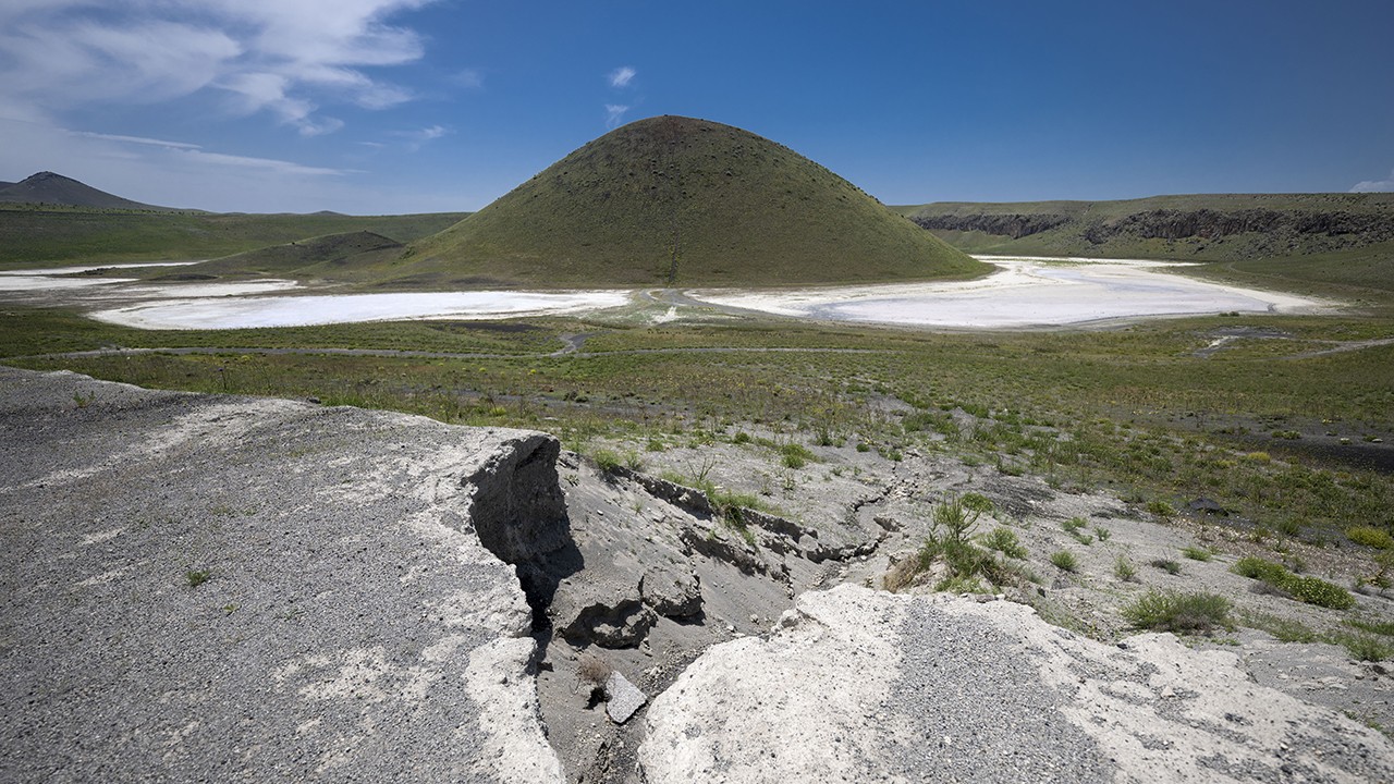 İklim değişikliği ve küresel ısınmaya bağlı olarak, yer altı su seviyesinin azalmasıyla kuruyan Meke Gölü, farklı renk tonlarıyla dikkat çekiyor.